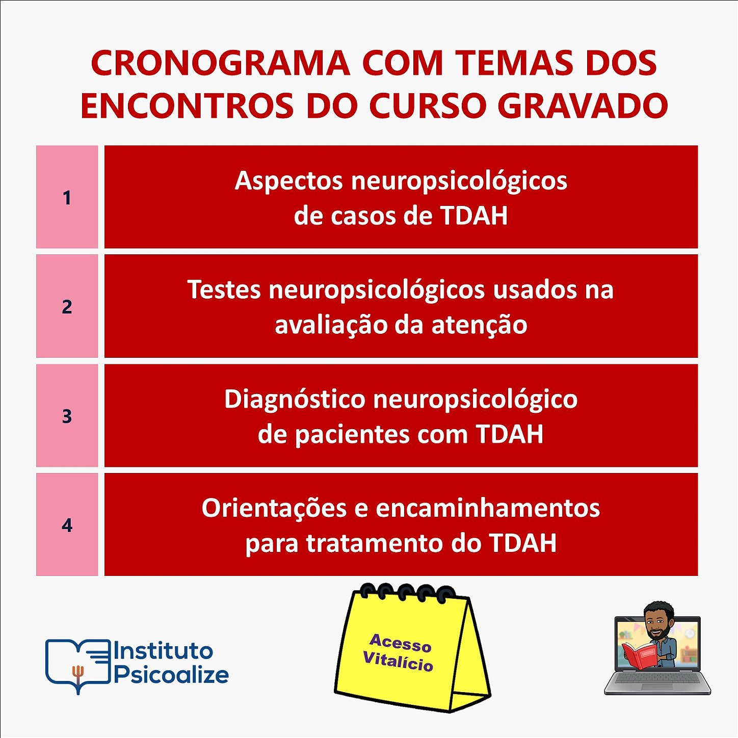 Nos encontros gravados desse grupo de estudos, foram abordados os aspectos neuropsicológicos de casos de TDAH, testes neuropsicológicos, cuidados no diagnóstico, possibilidades de tratamento e encaminhamentos para orientações e devolutiva diante do diagnóstico de TDAH.