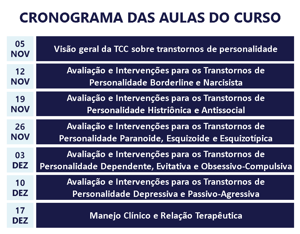 Este curso foi desenvolvido para oferecer formação prática e aprofundada, integrando teoria, estudos de caso, e técnicas aplicáveis ao contexto clínico real. Ao longo das aulas, o participante aprenderá a identificar padrões cognitivos e interpessoais característicos, elaborar formulações de caso precisas e aplicar estratégias terapêuticas eficazes e baseadas em evidências.