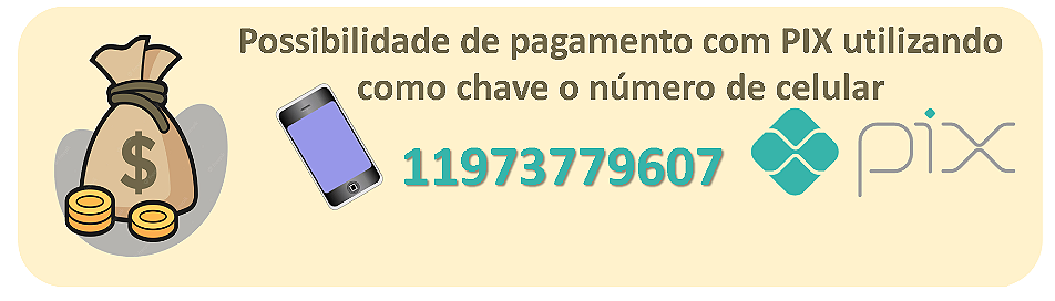 Para pagamento no PIX, utilize como chave PIX o número de celular 11973779607 e envie o comprovante para o WhatsApp indicado.